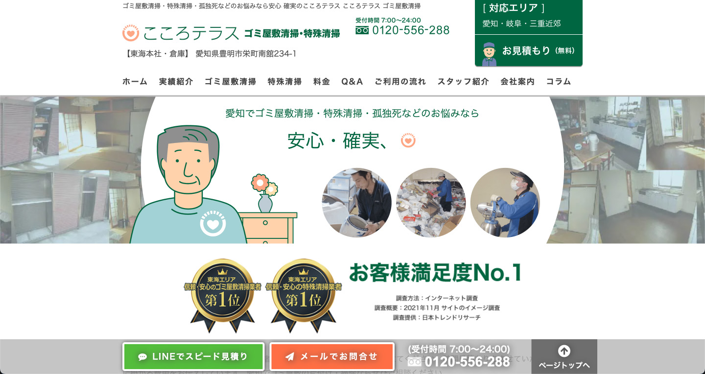 - こころテラス東海は、名古屋を中心に東海地方(愛知、岐阜、三重)のゴミ屋敷の清掃、片付けなど特殊清掃に対応する専門業者です。ゴミ屋敷や汚部屋の清掃から事故物件・孤独死現場の特殊清掃を行う専門業者です。ご遺族様と故人様の思いを大切に誠心誠意サポートいたします。