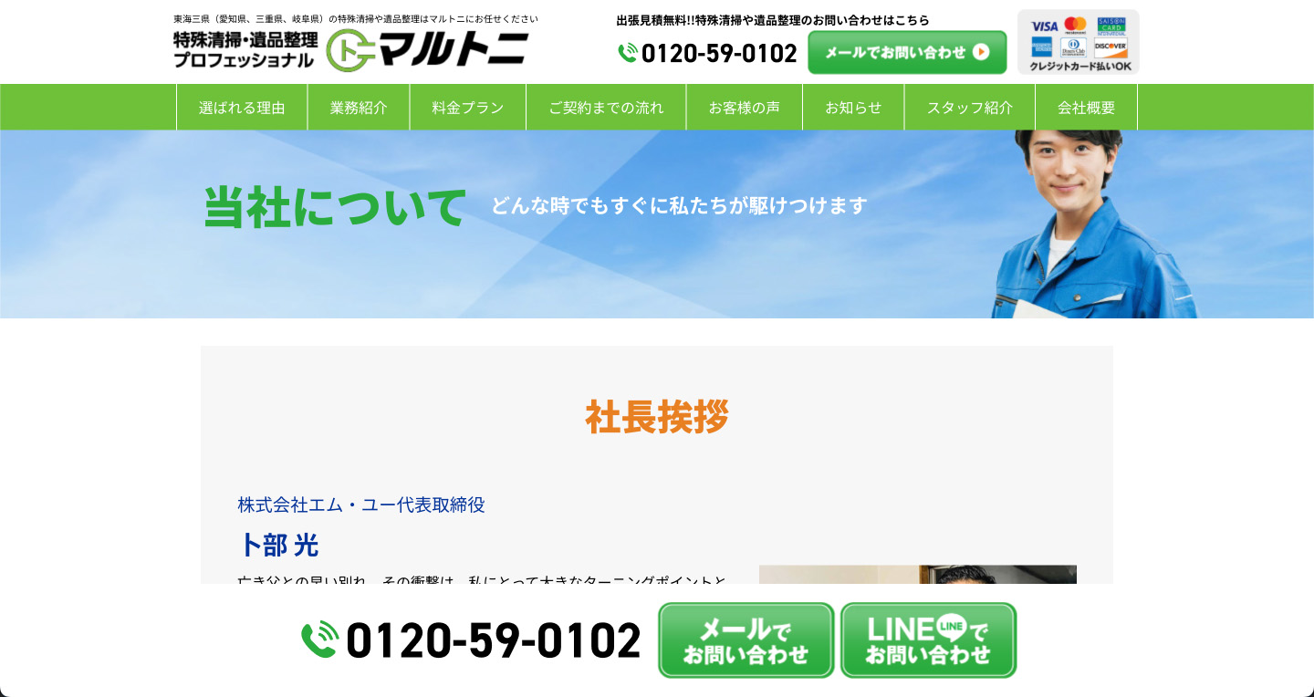 | 事業内容 | 特殊清掃、遺品整理、生前整理、ゴミ屋敷片付け、解体工事、ペット火葬、骨董品買取、リフォーム・ハウスクリーニング、各種手続き代行、不動産整理、仏壇クリーニング、消臭・脱臭処理、リサイクル品買取 |