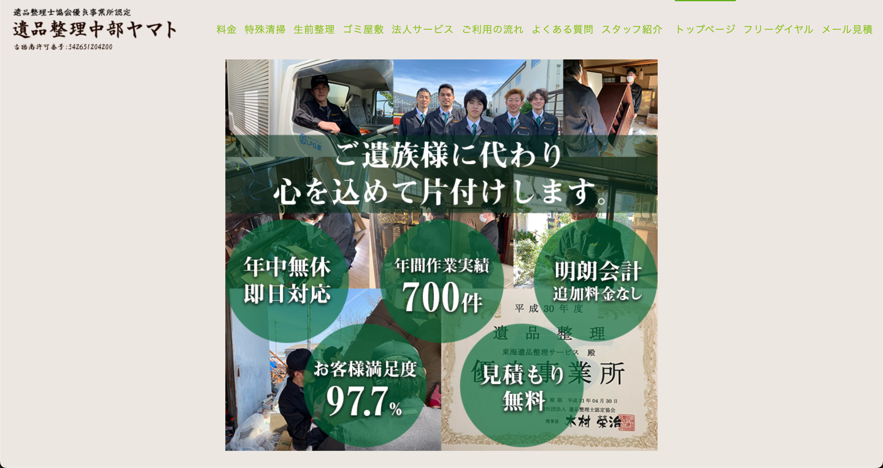 - 遺品整理・特殊清掃・生前整理なら遺品整理中部ヤマトにお任せ下さい。お見積りはもちろん無料で最短30分以内でお伺いいたします。遺品整理士・特殊清掃士が在籍しています。名古屋市は勿論愛知県・三重県。岐阜県全域で年中無休24時間対応しております。